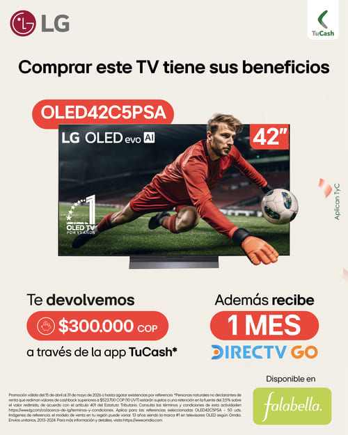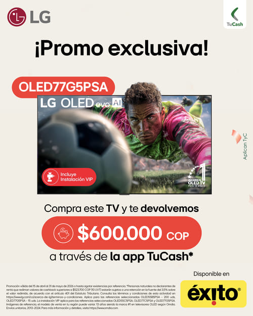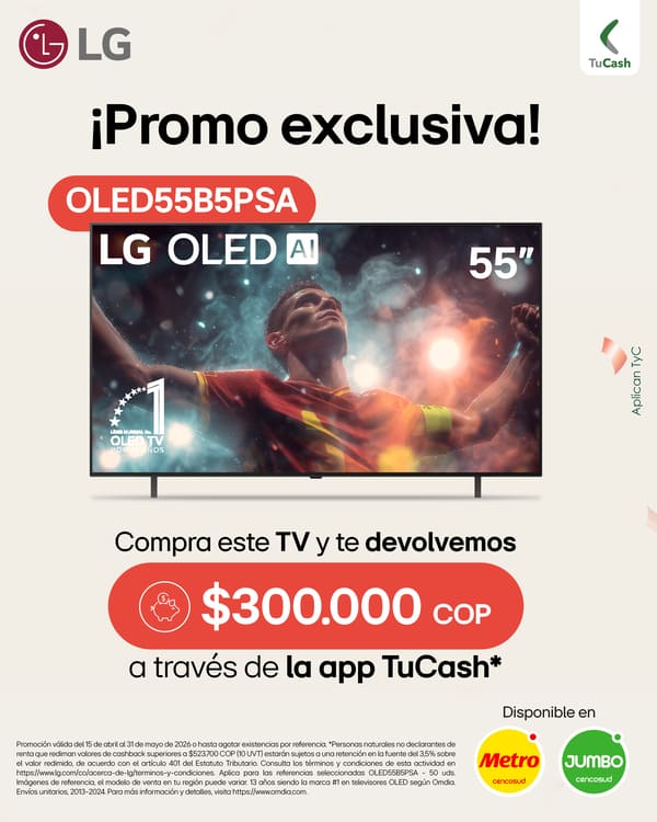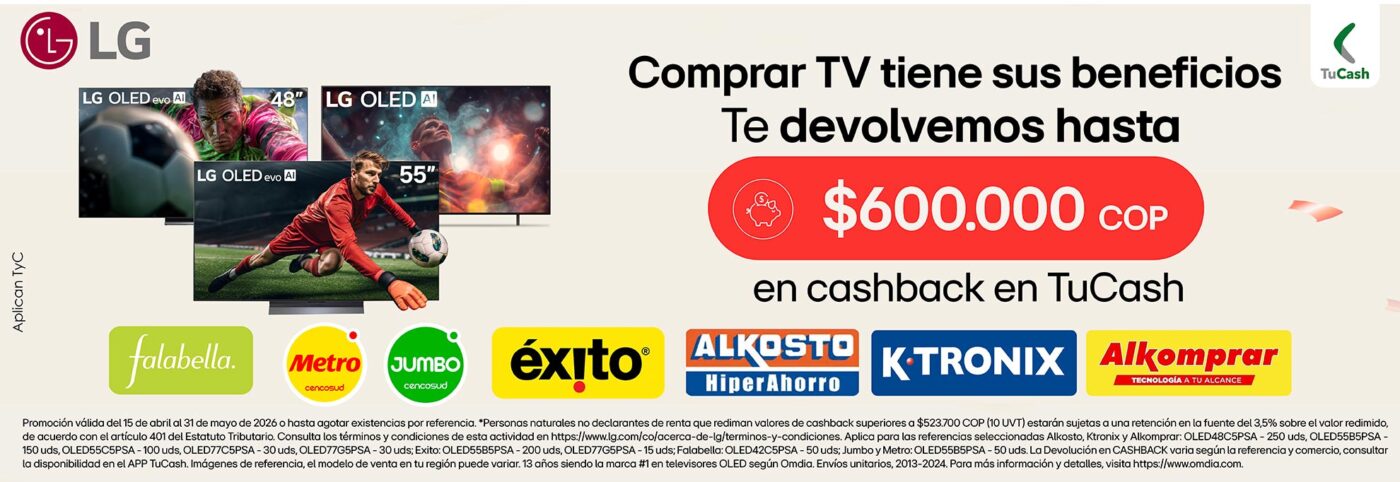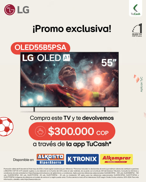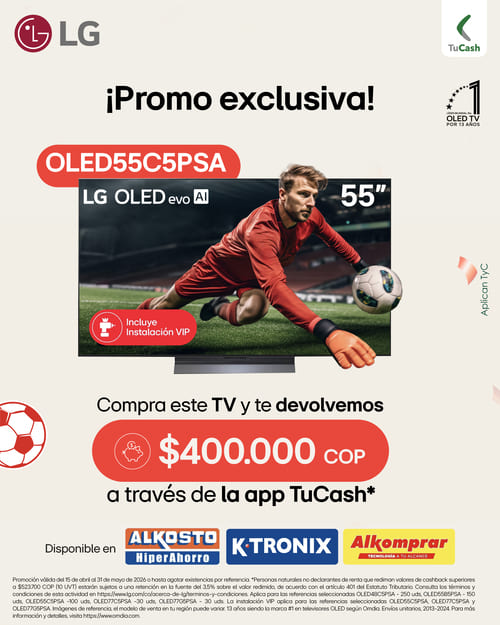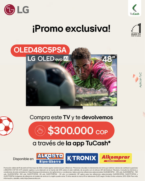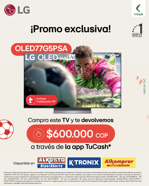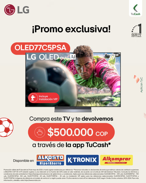 Promoción válida del 15 de abril al 31 de mayo de 2026 o hasta agotar existencias por referencia. *Personas naturales no declarantes de renta que rediman valores de cashback superiores a $523.700 COP (10 UVT) estarán sujetas a una retención en la fuente del 3,5% sobre el valor redimido, de acuerdo con el artículo 401 del Estatuto Tributario. Consulta los términos y condiciones de esta actividad en https://www.lg.com/co/acerca-de-lg/terminos-y-condiciones. Aplica para las referencias seleccionadas Alkosto, Ktronix y Alkomprar: OLED48C5PSA – 250 uds, OLED55B5PSA – 150 uds, OLED55C5PSA – 100 uds, OLED77C5PSA – 30 uds, OLED77G5PSA – 30 uds; Exito: OLED55B5PSA – 200 uds, OLED77G5PSA – 15 uds; Falabella: OLED42C5PSA – 50 uds; Jumbo y Metro: OLED55B5PSA – 50 uds. La Devolución en CASHBACK varia según la referencia y comercio, consultar la disponibilidad en el APP TuCash. Imágenes de referencia, el modelo de venta en tu región puede variar. 13 años siendo la marca #1 en televisores OLED según Omdia. Envíos unitarios, 2013-2024. Para más información y detalles, visita https://www.omdia.com.